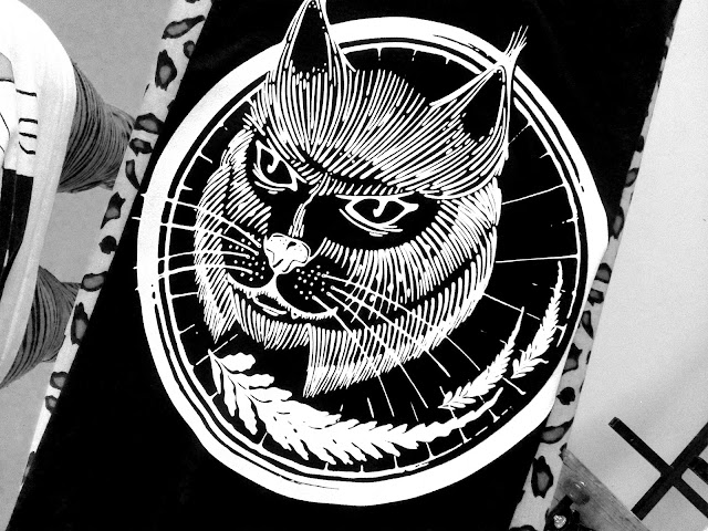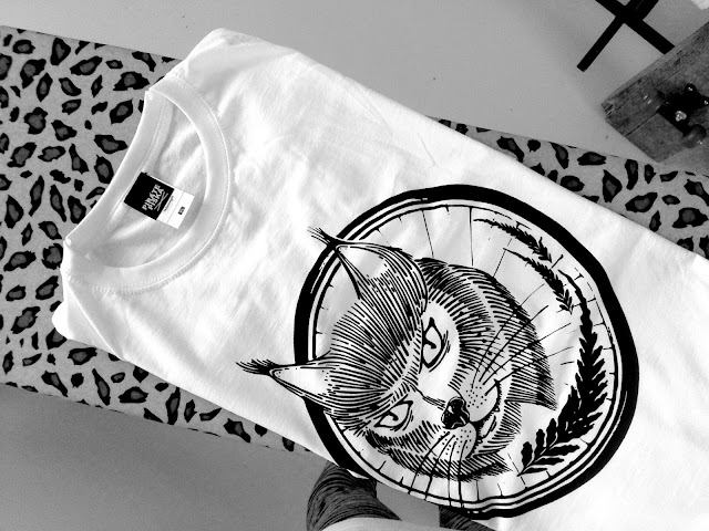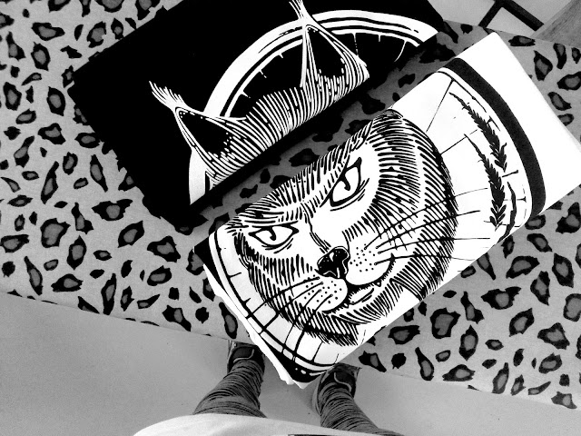 torej -brzdej boj paket je vseboval eno belo in eno črno majico z velikim potiskom custom ilustracije risa in še par presenečenj na strani ker, -če se že tiska majice, se lahko potiska še papir, itak! in zato sem naredila še par odtisov na papir za Majo in zame, za arhiv, za spomin. ris je nato odletel v Portland in od tam po ameriških cestah novim dogodivščinam naproti. jiihuu