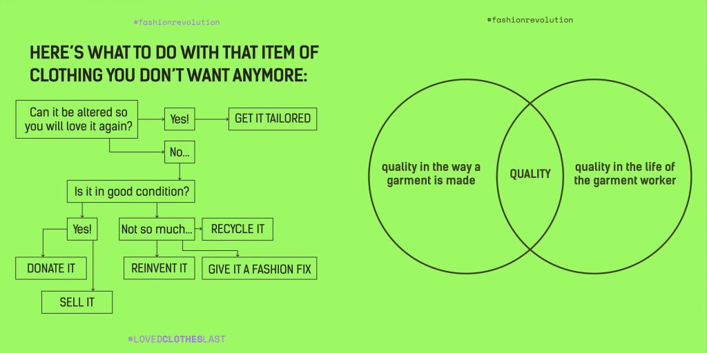Danes v povprečju kupimo 60 % več oblačil kot pred 15 leti. To se krepko pozna na naši denarnici, psihi, še bolj pa na okolju. Živimo v družbenem sistemu, ki nas spodbuja k nakupovanju, naša vrednost pa se meri v količini stvari, ki jim imamo. Če se začnemo bolje zavedati, koliko in kaj kupujemo, ter odstopimo od pričakovanih kapitalističnih norm pretiranega nakupovanja, ki niso dobre za nikogar drugega kot lastnike modnih znamk, bomo kaj hitro ugotovili, da nam tista majica s catchy napisom pač ne prinaša zadovoljstva. Kliči znamke k odgovornosti (naj bo to z vprašanjem pod greenwashing objavo na družbenih omrežjih ali pa s pismom) in odpiraj pogovore s svojimi bližnjimi. Navade potrošnikov so tiste, ki usmerjajo gospodarstvo. Samo pomisli, kaj vse se lahko spremeni!